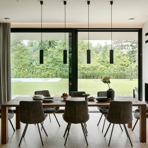 Jasne, minimalistyczne przestrzenie stały się tłem dla kolekcjonowanych przez właścicieli dzieł sztuki. To ona gra tu pierwsze skrzypce, nadając ton całej aranżacji, a tym samym przełamując stonowaną bazę wnętrza. Największy obraz – za stołem – jest autorstwa samej architektki – Agnieszki Musiał-Chmielnik.  Na kolumnie postawiona rzeźba w odważnym kolorze to dzieło Tomasza Koclęgi. Przy wejściu wita nas grafika Tomasza Szpunara, a klatka schodowa to kompozycja obrazu Magdaleny Nowatkowskiej z kultowymi grafikami Matisse’a. Na piętrze w holu ważnym akcentem jest także oryginalny żyrandol ręcznie wykonany ze szkła murano w kolorze kobaltowym.