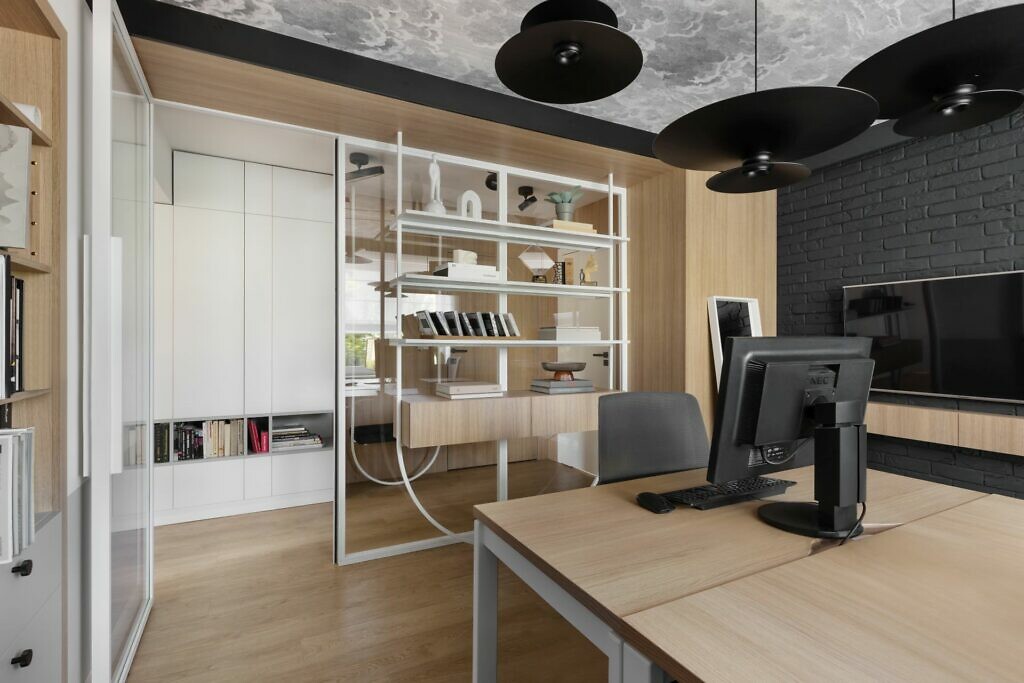Estetyka całości opiera się na wyważonej palecie barw: bieli, czerni, szarości i ciepłym drewnie. Nie zabrakło także wyrazistych akcentów, jak sufit przypominający wzburzone niebo czy graficzne uchwyty i lampy. W projekcie pojawia się wiele motywów znanych z realizacji Sokołowskiej dla klientów prywatnych i komercyjnych, co dodatkowo wzmacnia wrażenie spójności stylistycznej. Na uwagę zasługują także oryginalne obrazy zdobiące ściany pracowni, dzieła młodych artystów wylicytowane na aukcjach Młodej Sztuki. Ich obecność wprowadza do wnętrza niepowtarzalną energię i twórczy charakter.