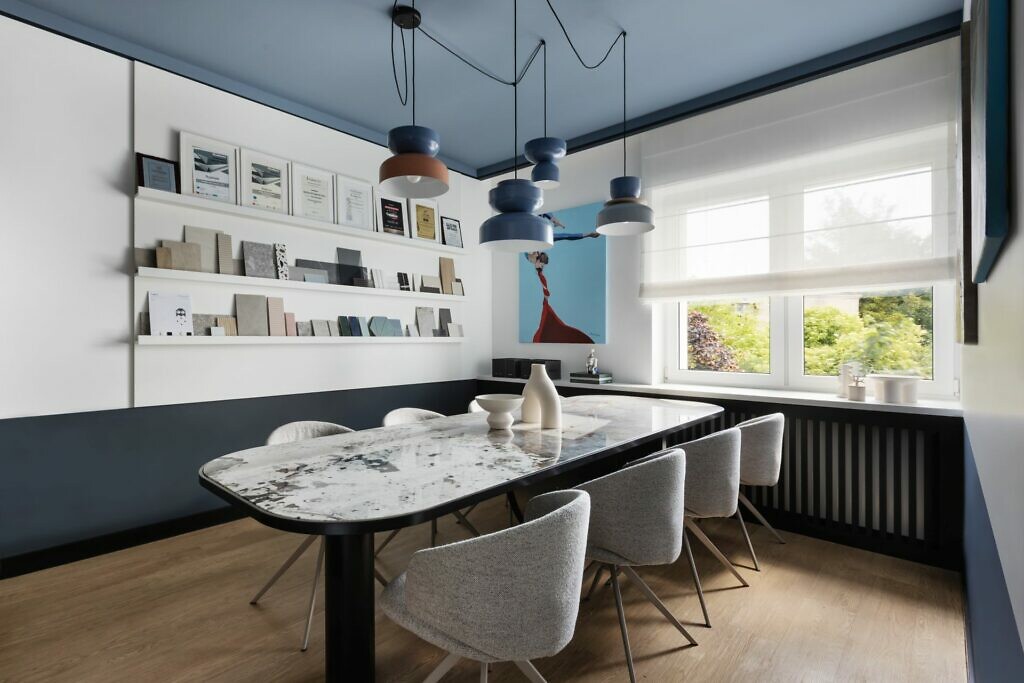 Strefę spotkań z klientami wyznacza reprezentacyjna sala z dużym stołem i z blatem z naturalnego kwarcytu Patagonia oraz kolekcją nagród, publikacji i certyfikatów. Właśnie tu prezentowane są nowe projekty, wizualizacje i materiały wykończeniowe. Korytarz z przeszkloną biblioteką i ekspozycją projektową oraz półki z publikacjami tworzą klimat miejsca, w którym design przenika się z codzienną praktyką. To przestrzeń, która opowiada historię pracowni, buduje zaufanie i zachwyca inwestorów już od pierwszego spotkania.