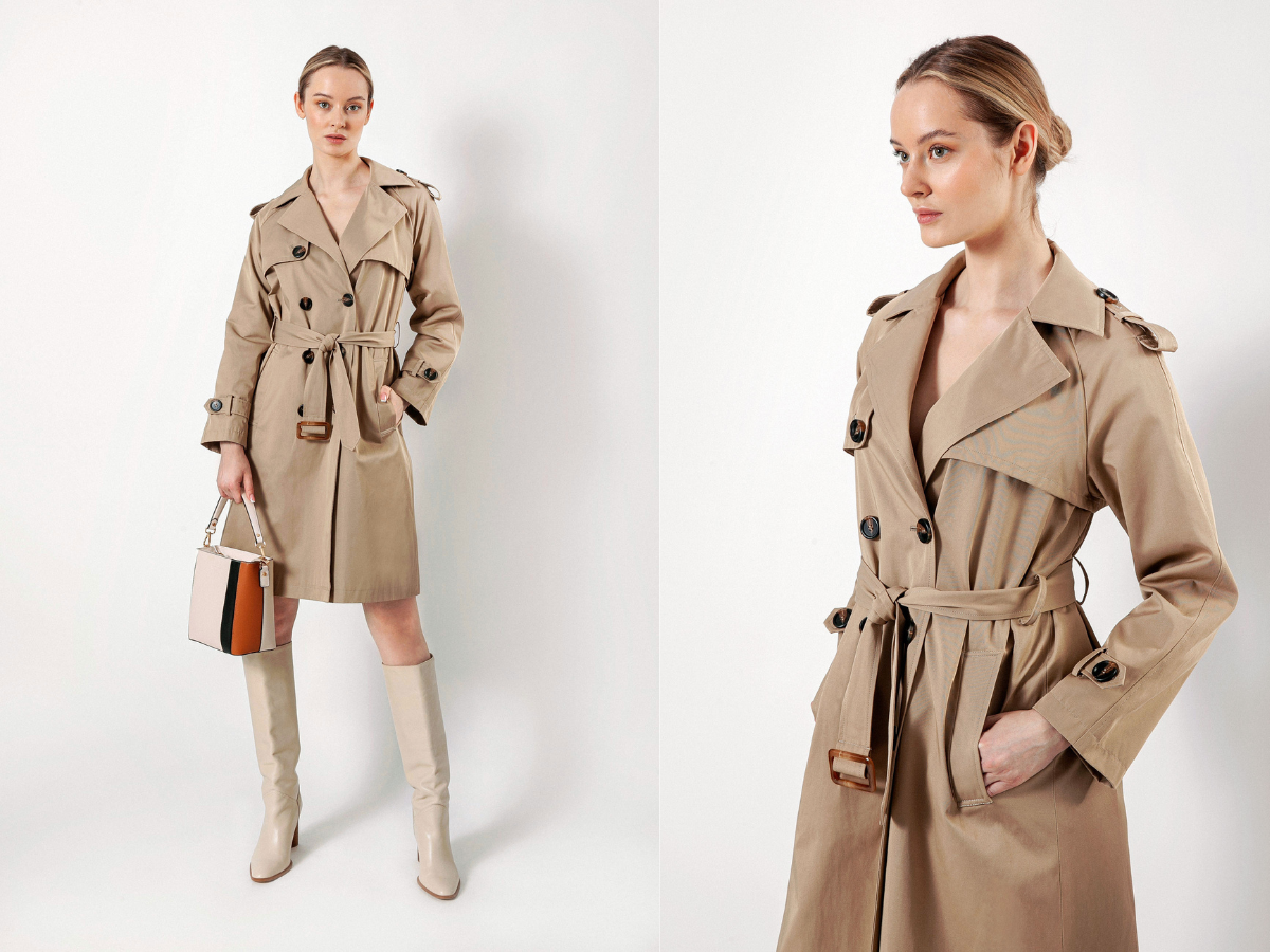 Zacznijmy od klasyki. Niezwykle elegancki, dwurzędowy trencz z dużą ilością bawełny w składzie. W kolorze beżu tuż przed kolano z regulowanym paskiem – idealnie podkreśli doskonałą stylizację. Brązowe guziki, które wybijają się na tle jaśniejszego płaszcza dodają mu charakteru. Doskonale sprawdzi się zestawiony z obuwiem na obcasie w podobnym odcieniu. Audrey Hepburn w filmie pt. „Śniadanie u Tiffany’ego” udowodniła, że stylizacje z udziałem beżowego płaszcza są modne i tym samym wprowadziła to ponadczasowe okrycie do świata mody.