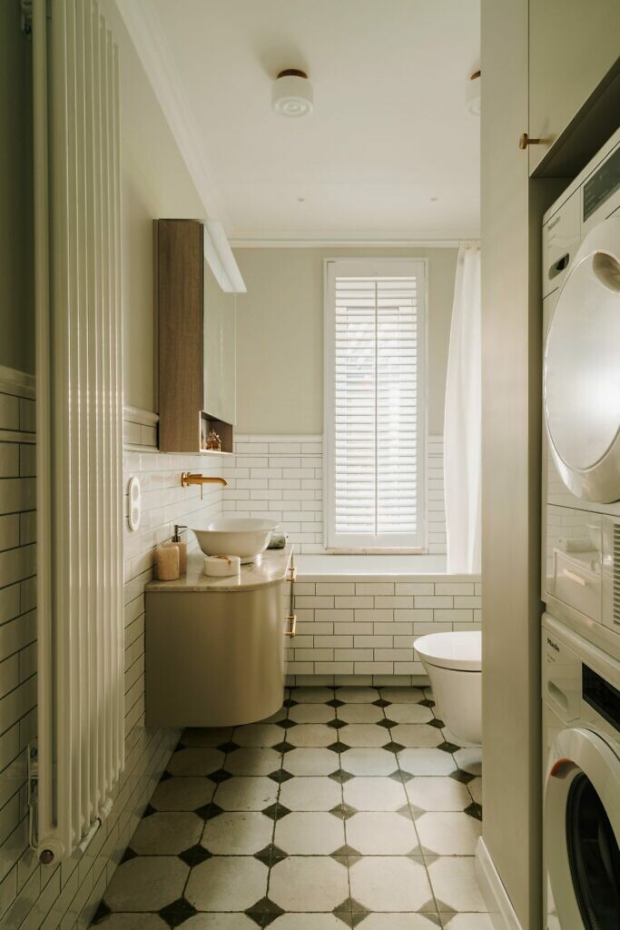 Apartament zlokalizowany jest na parterze budynku wielorodzinnego i posiada bezpośrednie wyjście do prywatnego ogrodu. Ograniczenia konstrukcyjne – łazienka usytuowana centralnie, pomiędzy kominami i ścianą nośną – wyznaczyły ramy projektowe. Zamiast rewolucyjnych zmian architektonicznych, projektantka skupiła się na poprawie funkcjonalności i doświetleniu wnętrza. Usunięcie fragmentu ścianki g-k pozwoliło otworzyć widok na okno tarasowe już od wejścia, a w jego miejscu zaprojektowano elegancką zabudowę szaf.