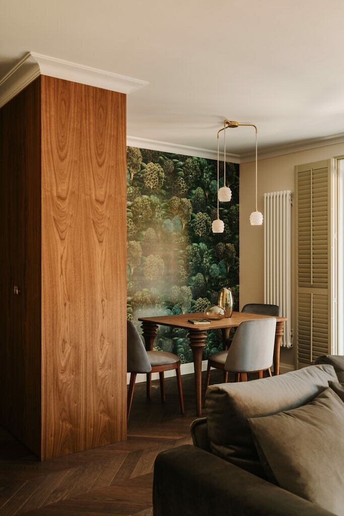 Wyrafinowany klimat części dziennej podkreślają krzesła i hokery włoskiej marki Calligaris z kolekcji Adel, wprowadzające do wnętrza nutę współczesnego designu. Ich lekka, nowoczesna forma doskonale kontrastuje z klasyczną bazą projektu, dębową podłogą ułożoną w jodłę francuską, orzechowymi fornirami oraz kamiennymi blatami. We wnętrzu dominują głębokie zielenie, oliwkowe ściany oraz tapety o roślinnych i baśniowych motywach. Tapety oraz sztukaterie pochodzą od firmy Arcydom i już od progu budują charakter wnętrza, nadając mu elegancki, lekko stylizowany wyraz. Motywy zwierzęce, w tym delikatna tapeta z sowami w pokoju dziecka, subtelnie nawiązują do pasji mieszkańców i wprowadzają element narracji.