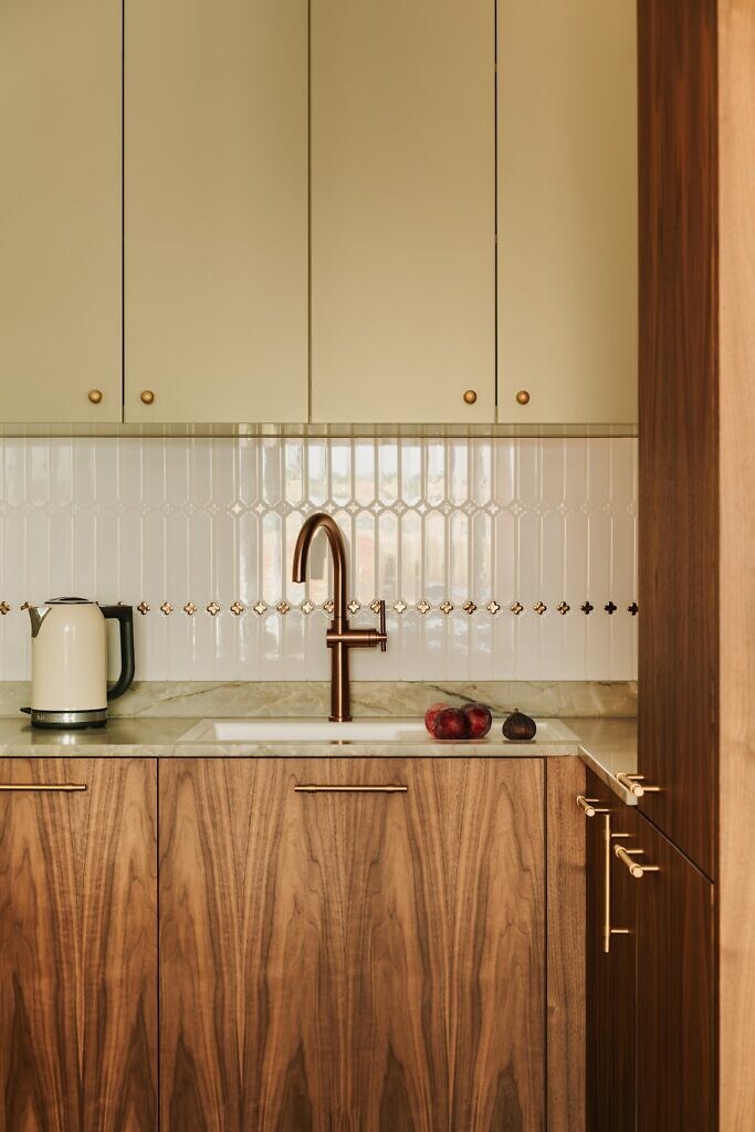 Układ mieszkania zachował dwie oddzielne sypialnie, przestronny salon z aneksem kuchennym oraz wygodne strefy przechowywania. Kuchnia została zaprojektowana „na miarę”. To funkcjonalna i wykończona szlachetnymi materiałami przestrzeń, w której chce się odpoczywać. Zabudowy meblowe oraz kuchnia zostały wykonane przez firmę Biurokoncept, co pozwoliło na idealne dopasowanie formy do potrzeb domowników i stylistyki wnętrza. Całość uzupełnia dekoracyjna mozaika marki Raw Decor, która stanowi wyrazisty, biżuteryjny akcent nad blatem roboczym. Półwysep kuchenny oraz stół w części jadalnianej pełnią również funkcję miejsca do pracy, z widokiem na ogród i taras, który w chłodniejszych miesiącach staje się dodatkowym pokojem, a latem chroni wnętrze przed słońcem.