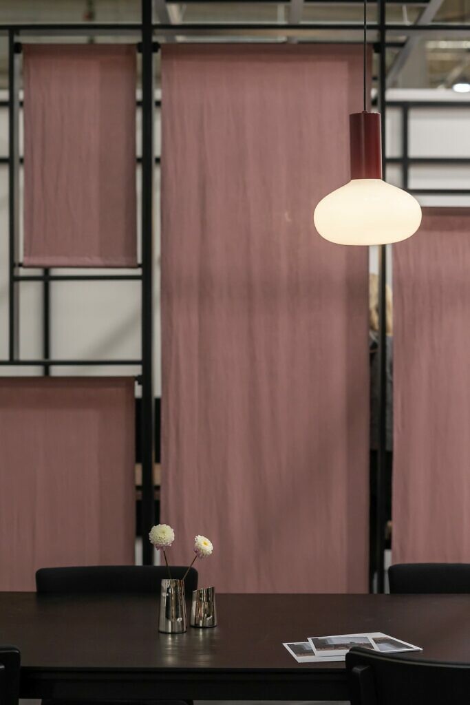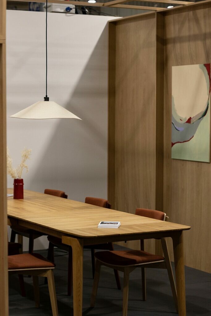 Stoisko MOTE wyróżniało się w tłumie targów w sposób nieoczywisty – nie ciężką, ekspresyjną formą, lecz spokojem, minimalizmem i naturalnym pięknem drewna. Przypominało japońskie wnętrze: oszczędne, harmonijne, wypełnione światłem i spokojem. Lekkie, półprzezroczyste tkaniny dzieliły przestrzeń na intymne „pokoje”, w centrum każdego z nich stał stół z litego drewna, który przyciągał uwagę i zachęcał do siadania i spotkań.