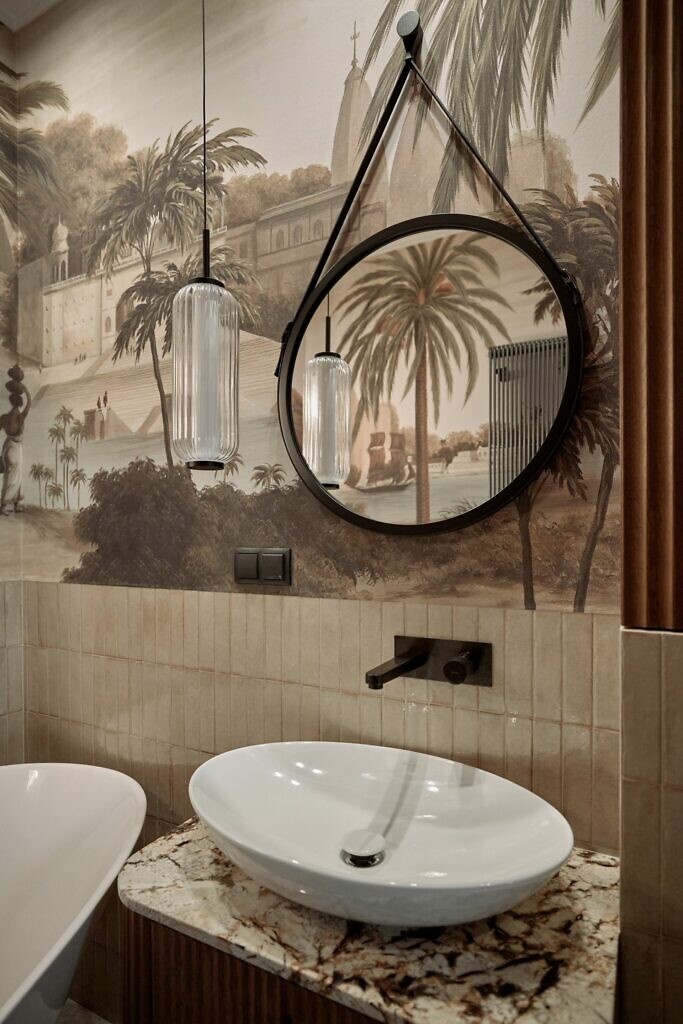 Już od pierwszego kroku przyszłych mieszkańców i gości wita subtelna gra światła odbijanego w lustrzanych powierzchniach. W holu znalazła się smukła skórzana ławka Fifties Calligaris, inspirowana latami 50. W części prywatnej apartamentu zastosowano egzotyczne tapety Ananbo, które nadają wnętrzu nieco kolonialnego charakteru. Miękkie tkaniny, ciężkie zasłony i stonowane barwy tworzą tu idealne warunki do wypoczynku. Połączona z sypialnią łazienka, wykończona wielkoformatowymi płytami inspirowanymi trawertynem, wzmacnia wrażenie luksusu. W apartamencie znajdziemy również kompaktowy gabinet, idealny dla osób pracujących zdalnie. Korytarz zaprojektowano tak, by zyskać dodatkową zabudowę, w której sprytnie ukryto pralnię, co uwalnia przestrzeń w łazienkach i zwiększa komfort korzystania z mieszkania.