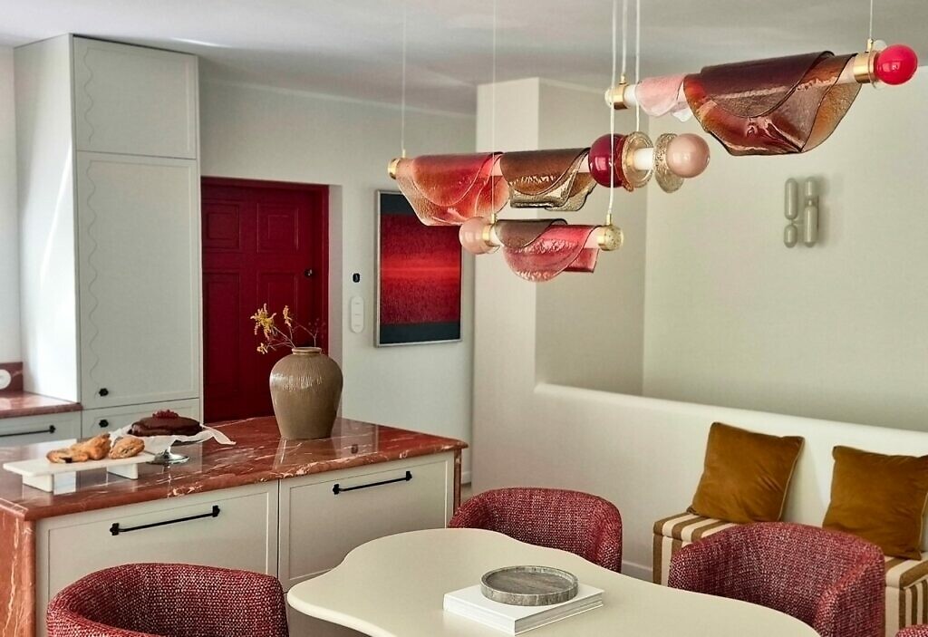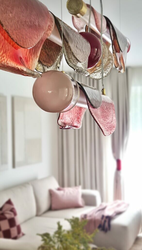 Dopełnieniem całości stały się obrazy przywiezione przez Olę z galerii oraz czerwone drzwi, które wymarzyła sobie Sonia. Wszystko zagrało idealnie. Ale bez wątpienia to właśnie lampa stała się głównym elementem wnętrza. Przyciąga uwagę i nadaje całości charakter. Ściana, na tle której została zawieszona, tworzy dla niej doskonałą scenerię. We wnętrzu dominują ciepłe barwy – kamienie, drewno, tkaniny – i właśnie to kontrastujące chłodne światło sprawiło, że kolory lampy nabrały jeszcze większej głębi. Każdy odcień ze środka odnalazł swoje odbicie w tej instalacji. Jakby cała przestrzeń została zamknięta i przefiltrowana w szkle.