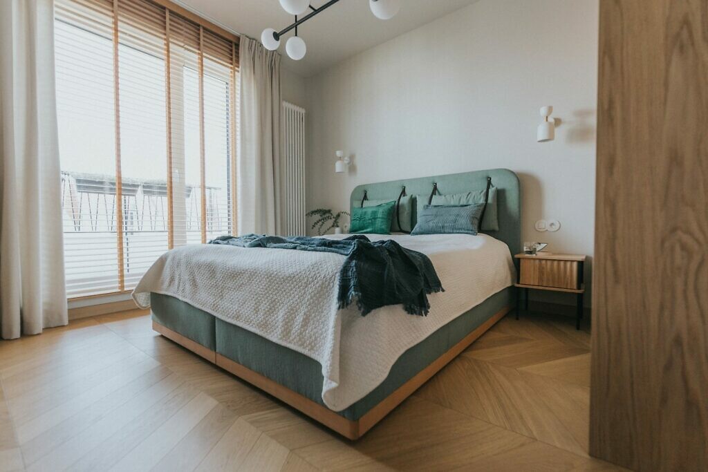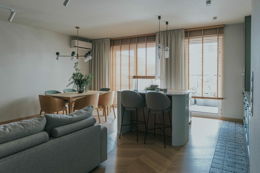 Motywem przewodnim w projektowanej przestrzeni uczyniono zieleń, która zagościła m.in. na ścianach podkreślonych strukturalnym tynkiem. Z części ścianek działowych zrezygnowano, by otworzyć przestrzeń salonu na kuchnię i jadalnię. Dzięki temu południowe słońce wlewa się bez ograniczeń przez balkon i dziedziniec z zabytkowymi platanami. We wnętrzu znajdziemy sporo naturalnego drewna. Dębowe forniry w specjalnie dobieranym piaskowym odcieniu pokrywają ściany i są składową zabudów. Na uwagę zasługuje też podłoga w postaci szczotkowanego i fazowanego parkietu, ułożonego we wzór jodełki węgierskiej.