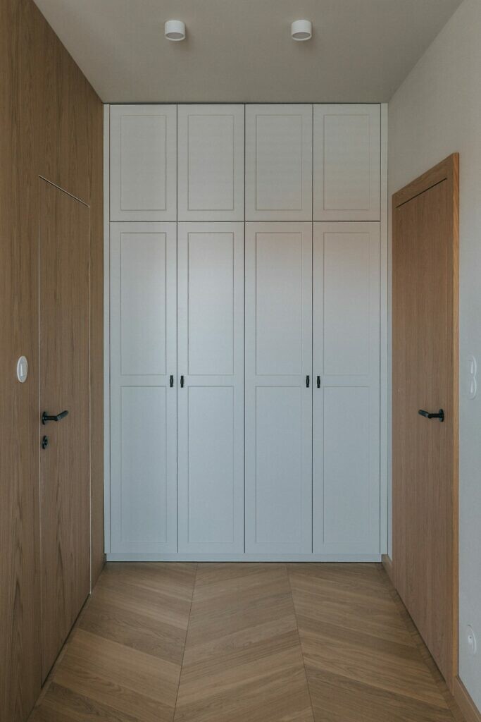 Wnętrze przemawia solidnym wzornictwem. Wygodne fotele z bukowymi, giętymi oparciami to flagowy produkt rodzimego Famega, za który poznańscy projektanci Pawlak i Stawarski otrzymali German Design Award. Gdyńskie studio Tamo Design stworzyło wyróżniające się formą regały i stoliki nocne. Zabudowa w strefie wejściowej została zaprojektowana z myślą o maksymalnej spójności i wizualnym porządku. W mieszkaniu zastosowano drzwi polskiej marki MORIC, zlicowane ze ścianą w fornirze dębowym, które niemal całkowicie wtapiają się w drewnianą okładzinę. Dzięki ukrytej ościeżnicy granica między ścianą a skrzydłem drzwi staje się ledwie zauważalna. To rozwiązanie chętnie stosowane przez MORIC, markę znaną z perfekcyjnego wykończenia i dbałości o detale stolarskie.