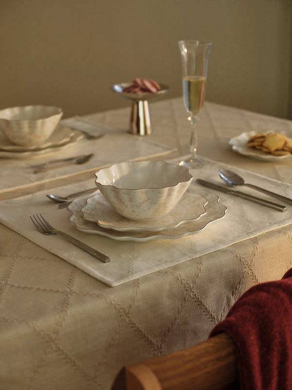 Okres Bożego Narodzenia tradycyjnie kojarzy się z czerwienią i złotem – barwami, które doskonale wpisują się także w świąteczną aranżację stołu, nadając jej elegancję, finezję i ponadczasowy charakter. W tym roku klasyczna paleta łączy się ze stylem Holiday Harmony, wprowadzając do wnętrza ukojenie i spójność. Na pierwszy plan wysuwają się białe talerze ze złotymi ornamentami, kontrastujące z czerwonymi tekstyliami i dodatkami, a całość dopełniają subtelnie zdobione kieliszki z delikatnym reliefem. Śnieżnobiały obrus podkreśli głębię świątecznych barw i stworzy idealne tło dla Twojej kreatywnej aranżacji.